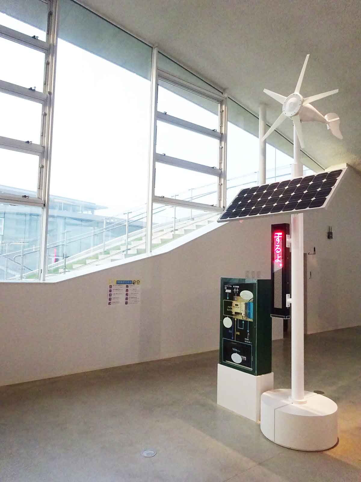 The company’s business includes production and sales of wiring harnesses (distribution cable sets) for construction machinery, designing of power supply/lighting apparatus, photovoltaic (PV), wind power and hydropower systems, and sales of batteries. A hybrid power generation system and a pico-hydro (micro hydro) power generator are displayed.