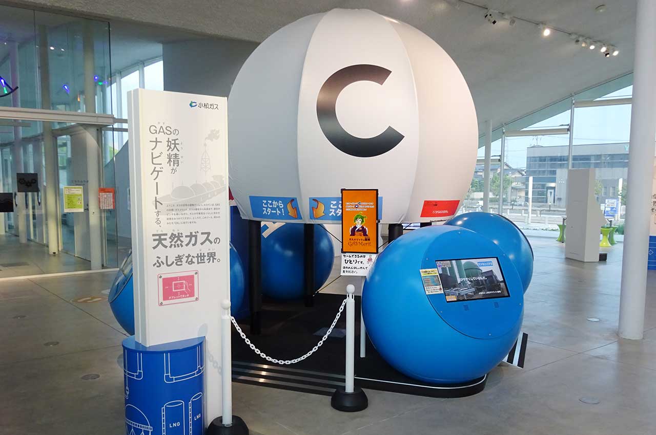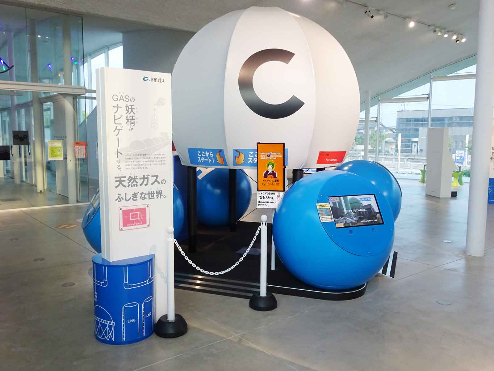The company’s display is a huge molecular model of methane (CH4). The white dome in the center represents carbon (C), and the light blue balls placed around it in four directions represent hydrogen (H). Methane is the main component of natural gas, an energy that emits less CO2 compared to other fossil fuel.