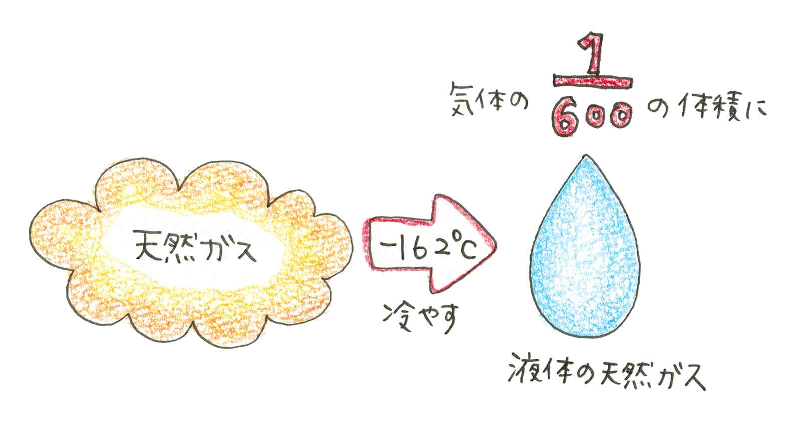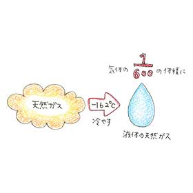 Natural gas is cooled to about -160 degrees Celsius and liquefied before transportation. The volume shrinks by a factor of 600. Once in Japan, it is converted back to gaseous form and the composition is adjusted, after which it is delivered to our homes via gas pipes.
