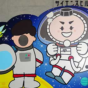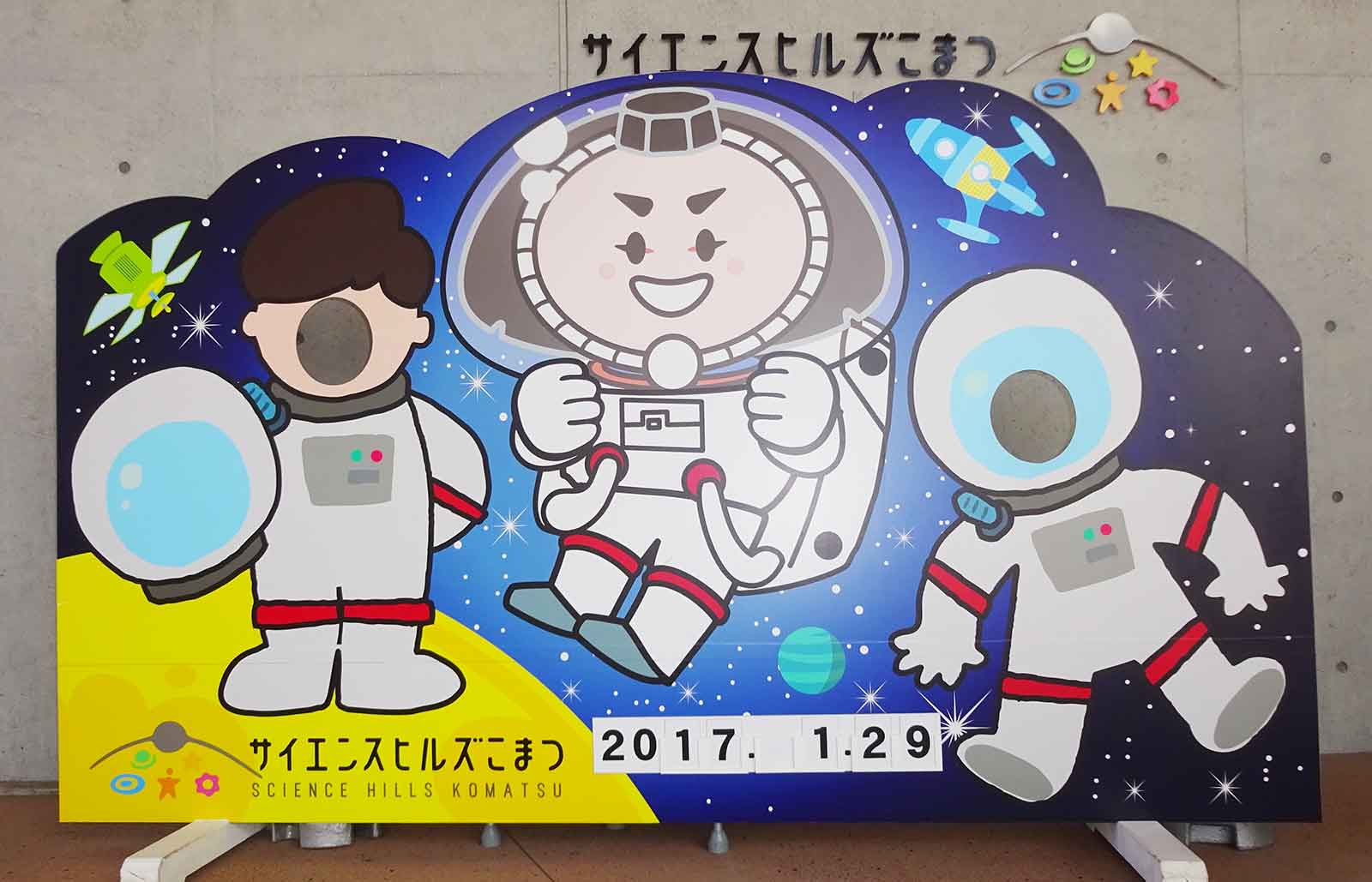 There is a comic foreground of Kabukky, Komatsu City's mascot character, in front of the entrance. You can find Kabukky in space suit only in Science Hills Komatsu. -
