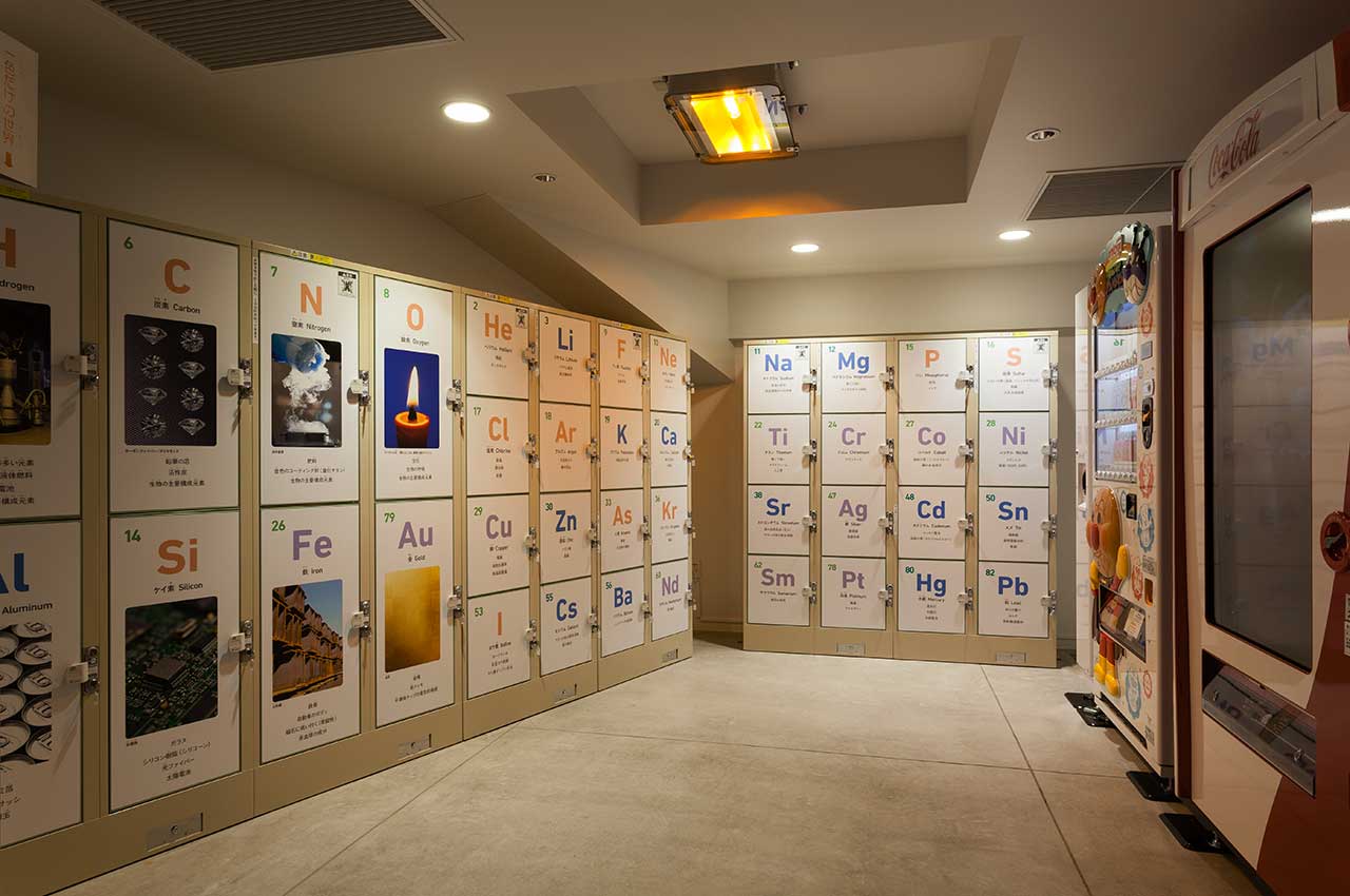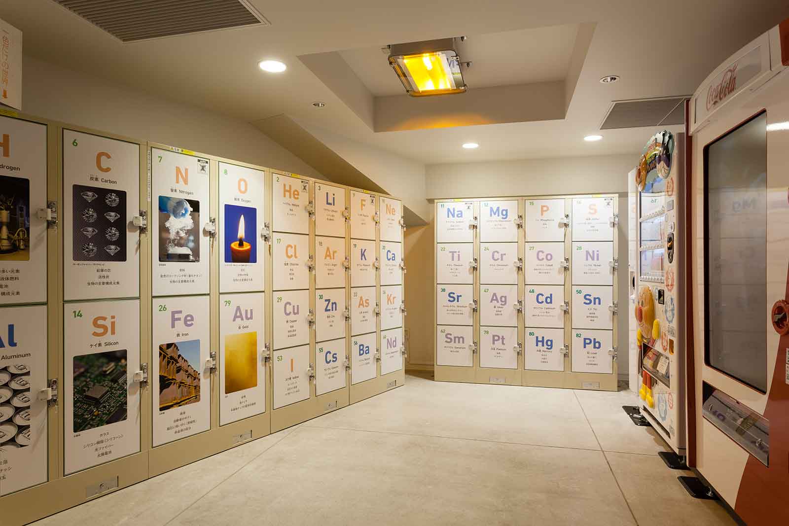 Element symbols and pictures of the things we daily use are put up on the locker. A variety of colors are used, and you can enjoy the colorful world. But let's see what happens to the colorful world when the fluorescent light is changed to the sodium lamp light.