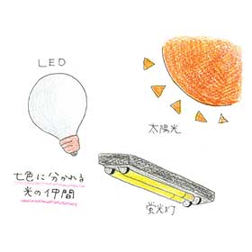 We usually recognize the color of an object through the light that splits into seven colors after passing a prism (e.g. Fluorescent light or sunlight) reflected on the surface of an object. The sodium lamp is a monochromatic light. It reflects and appears only orange. -