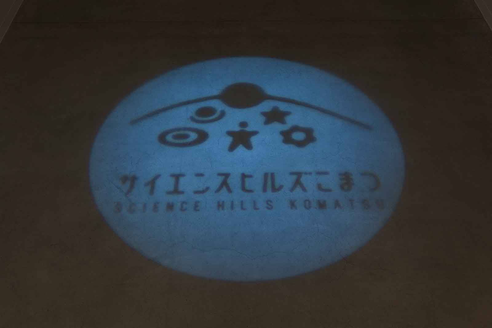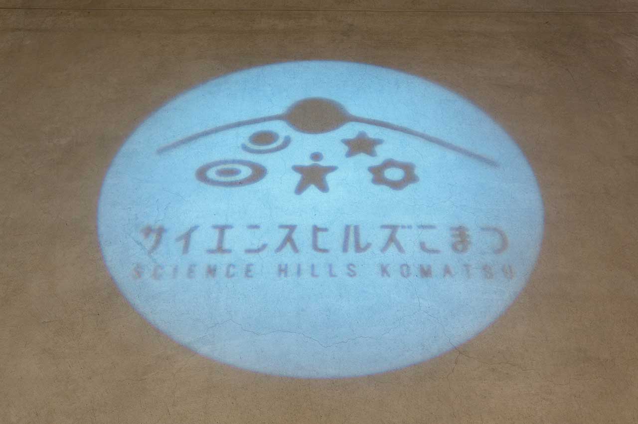 A logo of SCIENCE HILLS KOMATSU is projected on the floor. After a while, "water wave patterns" appear. A sensor installed on the ceiling reacts to visitors and the reaction move a device to tap the water surface to create wave patterns. A lot of waves are hiding around us.