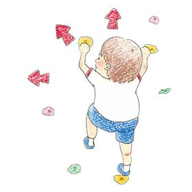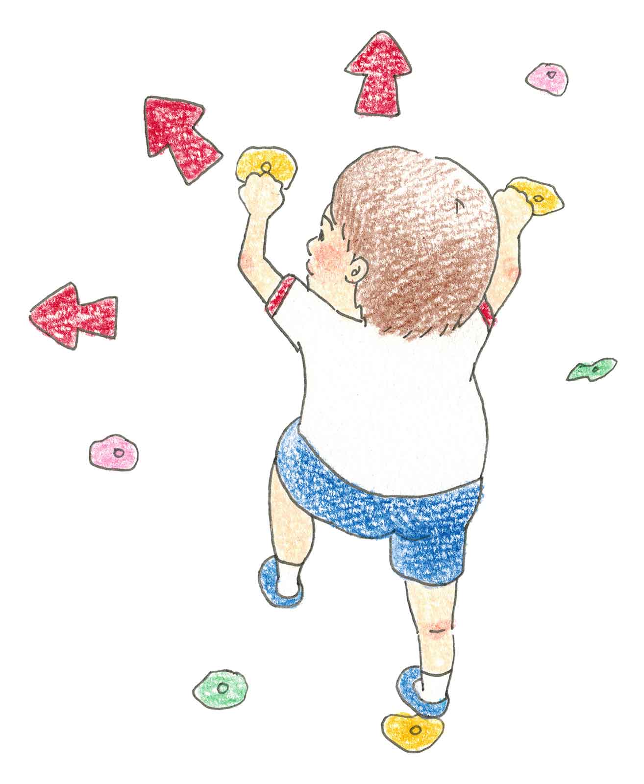 Colors of bouldering holds indicate a challenge level. Let's climb following the same colored holds. Green is the beginner level, yellow is medium, and pink is advanced. -