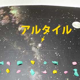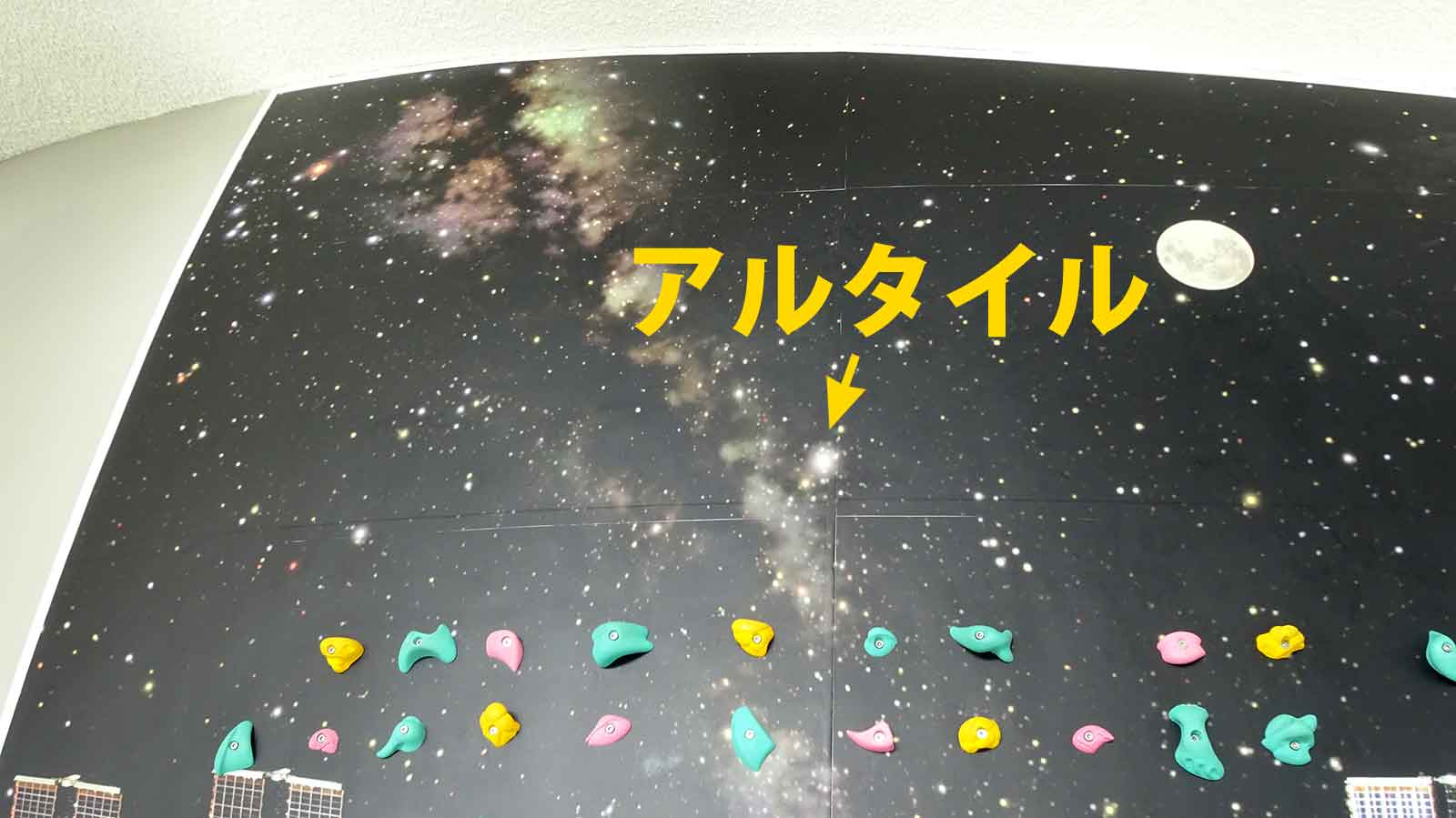 Let's find the Summer Triangle on the wall painting! Find the Altair in Aquila, and now let's try to climb the wall aiming to touch the star!